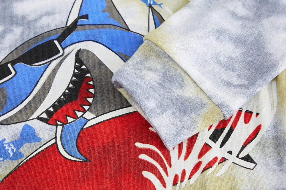 - Kialakítás: Tiedye minta és ragyogó színek dinoszaurusz és cápa mintával