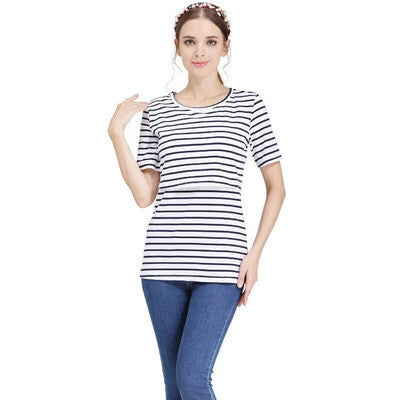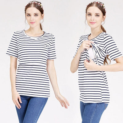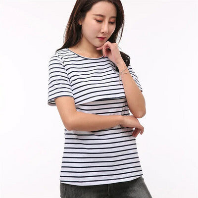 Női Kismama Szoptatós Póló, Rövid Ujjú Felső (Fekete-Fehér Csíkos) S