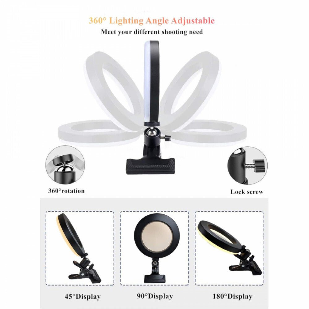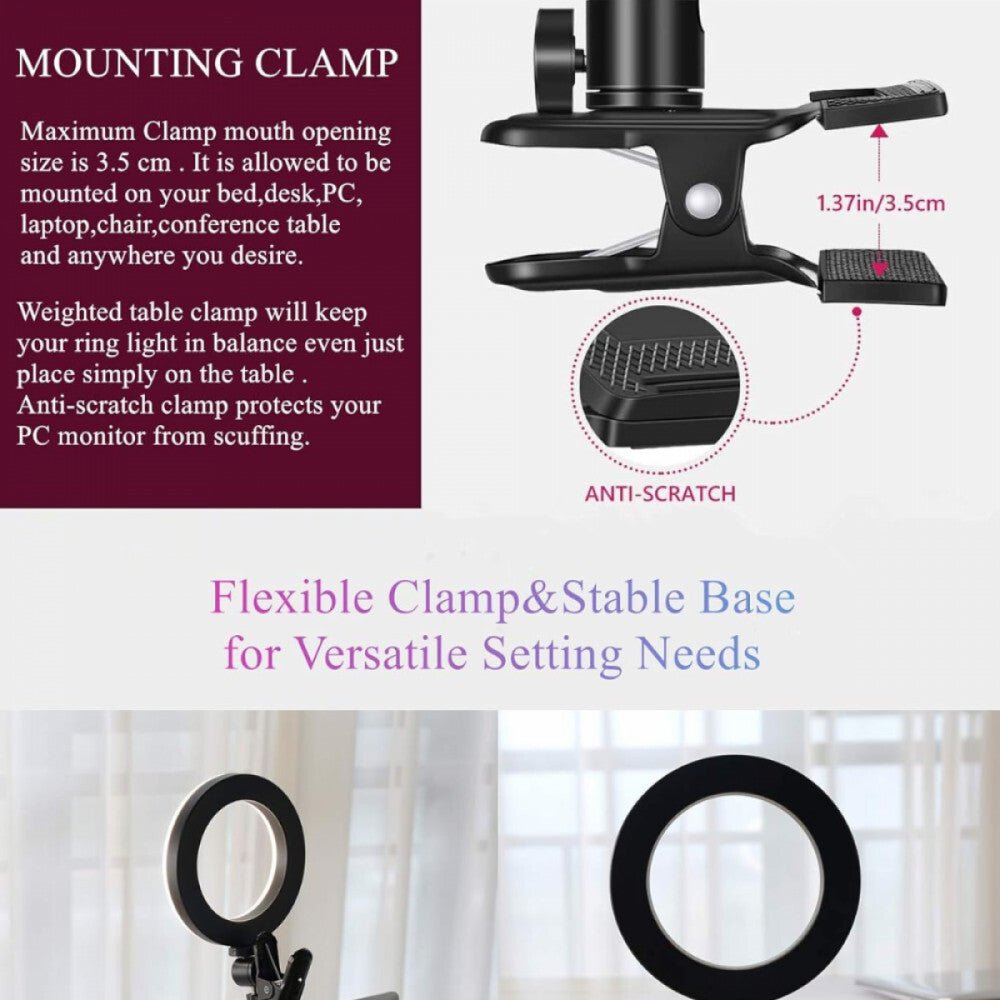 - Kompakt gyűrűs lámpa rögzítőbilinccsel: 16 cm-es kompakt kialakítás, karcmentes rögzítőbilincssel (max. nyílásméret: 3,5 cm/1,38 hüvelyk) lehetővé teszi, hogy ezt a gyűrűs lámpát íróasztalára, laptopjára, székére, ágyára, tárgyalóasztalára vagy akár számítógépére is felhelyezze monitoron, laptopon és bárhol, ahol csak akarja, erős stabilitással. A súlyozott fém bilincs egyensúlyban tartja a LED gyűrűs lámpát, még akkor is, ha egyszerűen az asztalra helyezi.