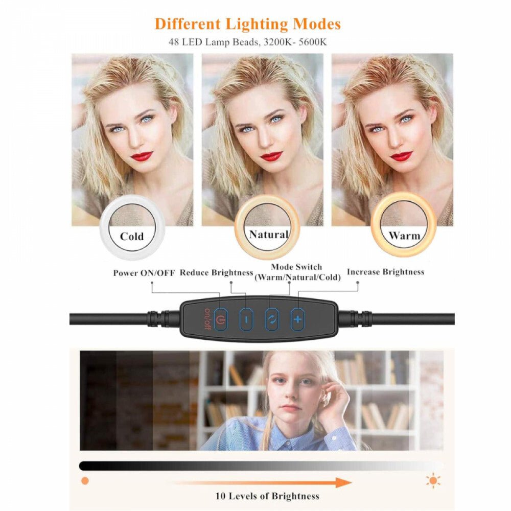 - Állítható fényerő és szín: A LED gyűrűs lámpának 3 világítási színe van, meleg, meleg fehér, és fehér. Minden világítási mód 10 különböző fényerővel rendelkezik. A színhőmérséklet 3200K (meleg) és 5600K (hideg) között állítható. Az élénk színek egyedi hangulatot teremthetnek, és megfelelnek az Ön különféle igényeinek.