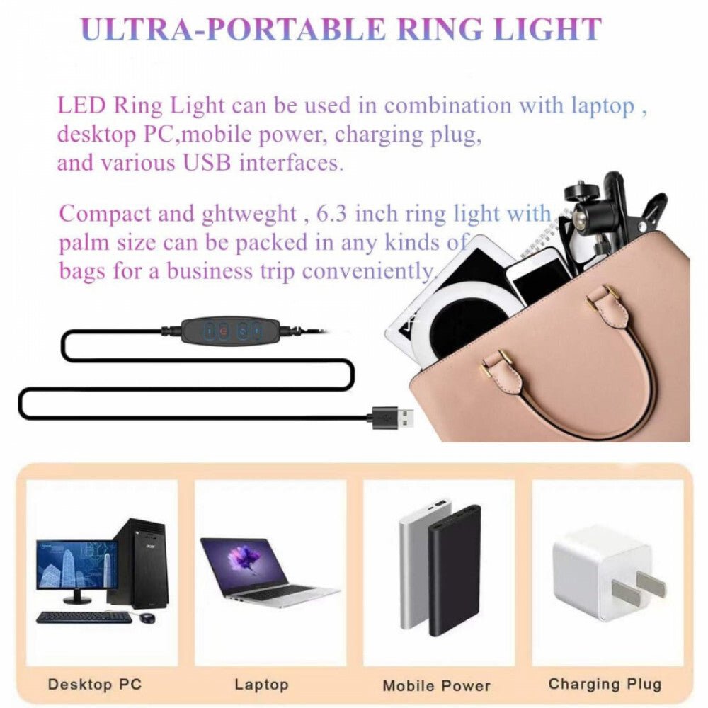 - USB-Tápellátású: Használható laptopokkal, PC-kkel, mobil akkumulátorokkal, USB töltőkkel és különféle USB interfészekkel. Szabályozhatja a be-/kikapcsolást, és átkapcsolhat kedvenc világítási módjára. A tápkábel kb. 200 cm hosszú, és bárhol használhatod, például olvasni a hálószobában, dolgozni az irodában, sminkelni a fürdőszobában, szabadtéri kempingezni és élő közvetítéseket végezni. A gyűrűs lámpa stabilan működik 5V/2A hálózati adapterrel.