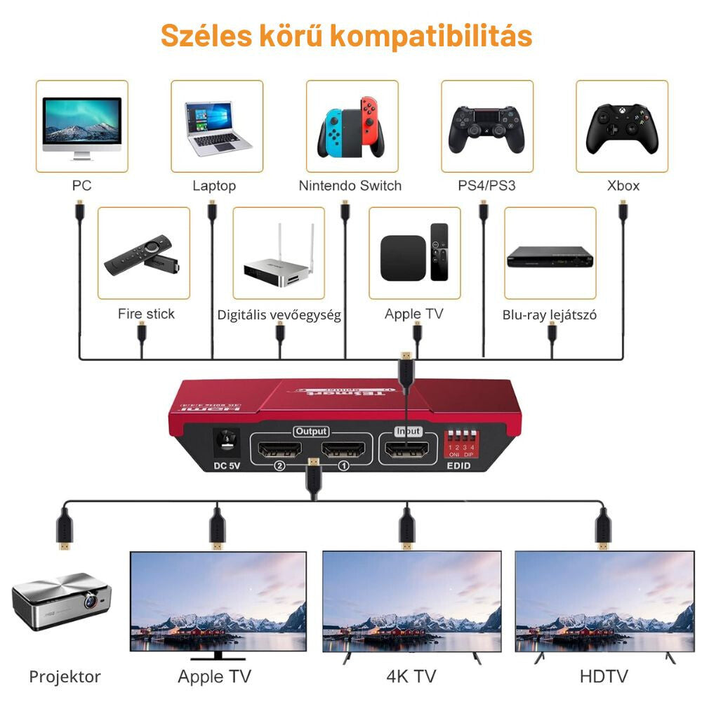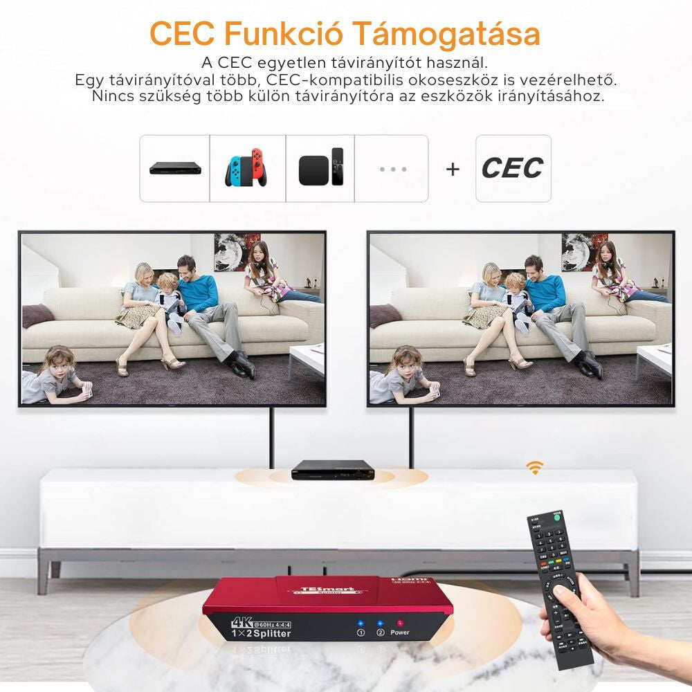 - TESmart HDMI Splitter – 1x2 (1 bemenet 2 kimenet), 4K@60Hz, EDID, CEC, HDCP 2.2